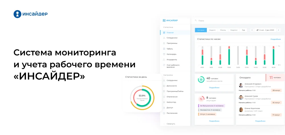 Сервис мониторинга сотрудников ИНСАЙДЕР предлагает комплексное решение для учета рабочего времени и контроля действий сотрудников за компьютерами. С его помощью руководитель сможет оптимизировать рабочие процессы, повысить дисциплину и обеспечить прозрачность работы сотрудников в организации.